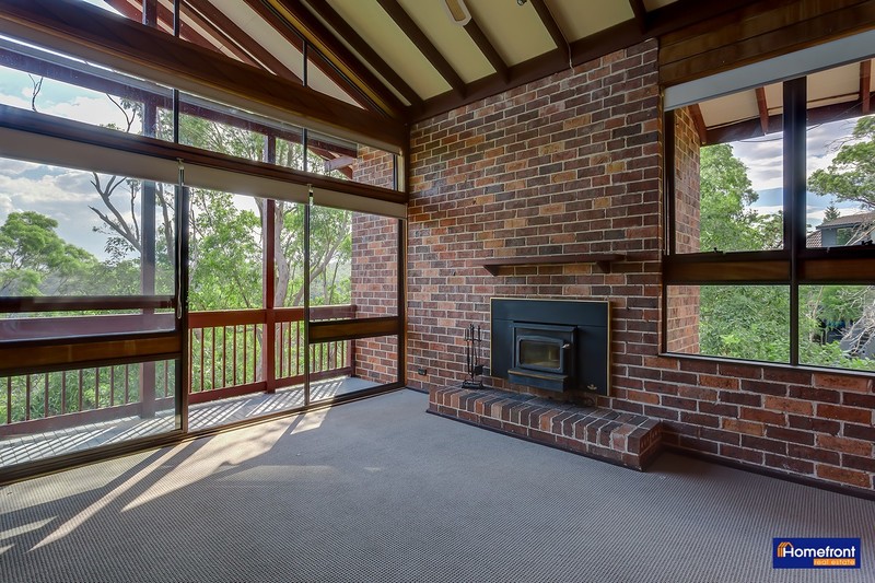 Enchanting formal living with a wood burning fireplace and a timber deck overlooking Elouera Bush Land Reserve.