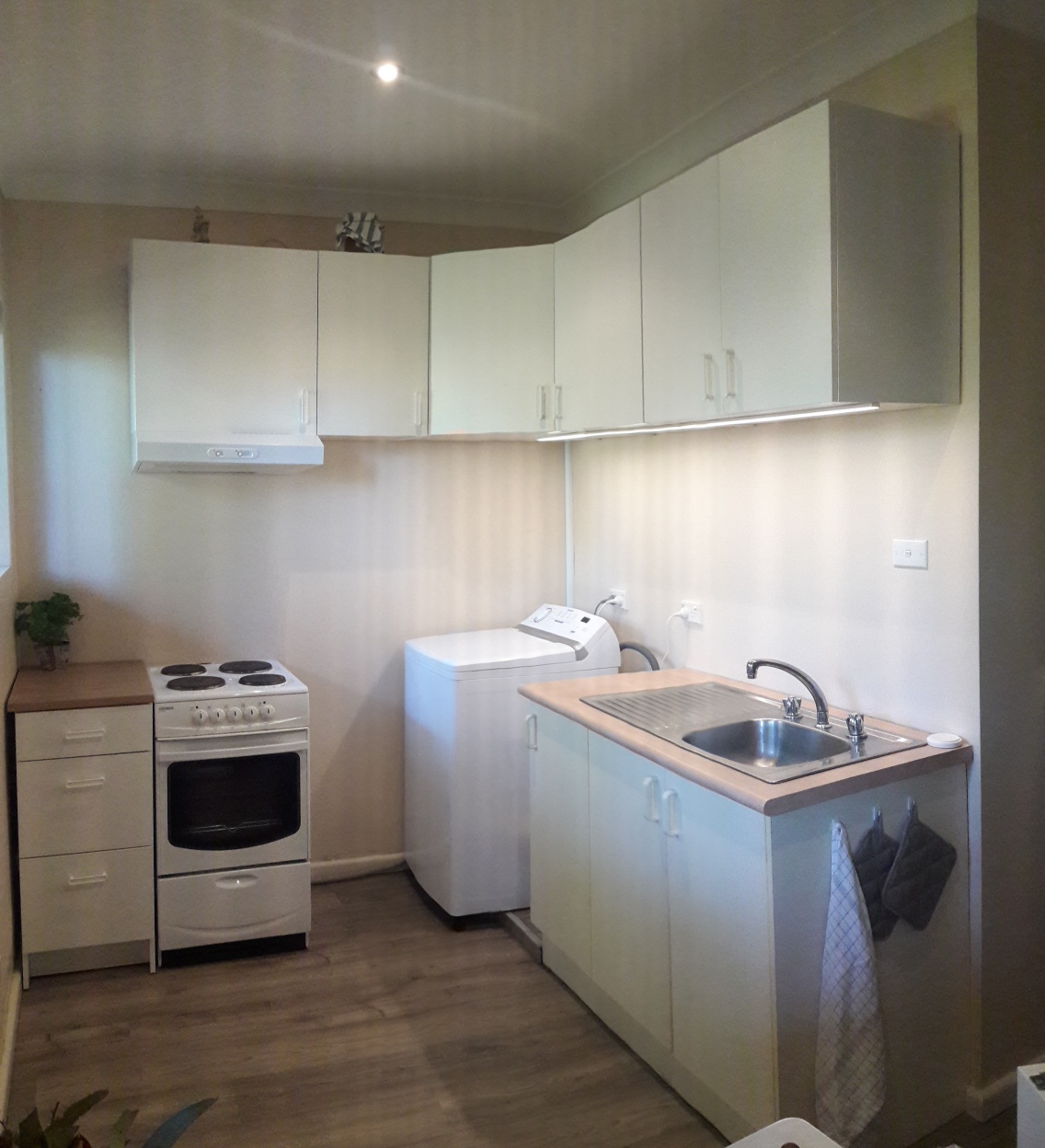 Cosy kitchenette area and laundry with near new cabinets